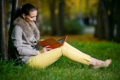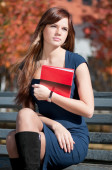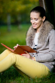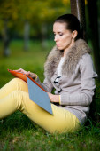 biznes kobieta, przeglądając dziennik w parku