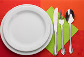 biały pustej płyty z widelec, łyżka, nóż na czerwony Obrus