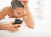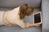 Zrelaksowany kobieta, leżąc na kanapie i oglądać tv w loft Apartament