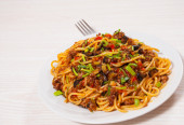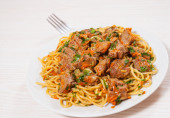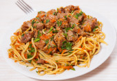Kawałki mięsa i warzyw z spaghetti