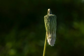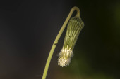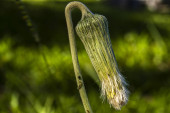 Makro mniszka lekarskiego po rozkwicie, opadające, przekształcające się w pappus nasienny. Podświetlony słońcem, ukazuje naturalny cykl odnowy, kruchości i odporności na miękkie zielone tło.