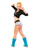 portret pełnej długości wskazującego palca wesoły nowoczesnej dziewczyny w miejsce