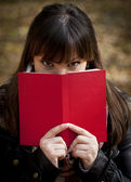 uczeń Dziewczyna czytająca książkę na ławce jesień las