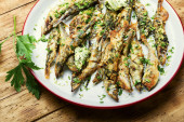 Zdjęcie "Śródziemnomorskie jedzenie. Danie pyszne wypchane sardynki au gratin z sosem pietruszkowym i cytryną na białym tle. Bezpośrednio nad." może być wykorzystywane do celów osobistych i komercyjnych zgodnie z warunkami zakupionej licencji Royalty-free. Obraz jest dostępny do pobrania w jakości wysokiej rozdzielczości do 5760x3840.