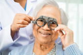 Zdjęcie "Optymista sprawdza azjatyckie starsze kobiety okulistyczny wzrok test oczu i przy użyciu optycznej ramy próbnej." może być wykorzystywane do celów osobistych i komercyjnych zgodnie z warunkami zakupionej licencji Royalty-free. Obraz jest dostępny do pobrania w jakości wysokiej rozdzielczości do 5760x3840.