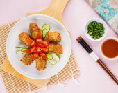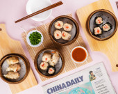 Różne chińskie Dimsum w koszu bambusowym. Dimsum to duży wybór małych dań, które Kantończycy tradycyjnie korzystają w restauracjach na śniadanie i obiad.