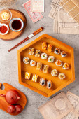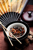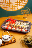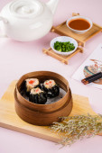 Pierogi z wodorostów w bambusowym koszu na parę. Dimsum to duży wybór małych dań, które Kantończycy tradycyjnie korzystają w restauracjach na śniadanie i obiad.
