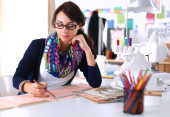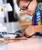 Młoda kobieta szyje siedząc w miejscu pracy