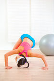 skoncentrowany młoda dziewczyna wykonujący ćwiczenia jogi na piętrze w domu
