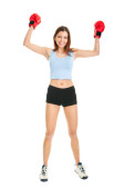 przyjemność młoda dziewczyna sprawny w Rękawice bokserskie, trzymając się za ręce, podniósł