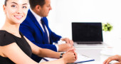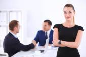 Portret piękne kobieta siedzi w biurze z kolegami w tle