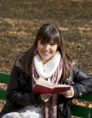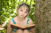 portret uśmiechający się uczniem czytanie książki w przyrodzie