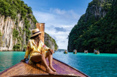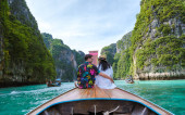 Para cieszy się spokojną przejażdżką łodzią po malowniczym jeziorze Cheow Lan, otoczonym bujną zielenią i wysokimi wapiennymi klifami. Doskonała ucieczka w samym sercu Parku Narodowego Khao Sok Tajlandia