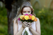 Młoda kobieta piękny jasny bukiet kwiatów, na zewnątrz, ciepły słoneczny dzień