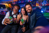 Młode kobiety uśmiechnięte i bawiące się podczas żywej imprezy sylwestrowej lub uroczystości, trzymające kolorowe koktajle podczas jazdy samochodem w nocy, cieszące się wspólnym życiem i życiem nocnym