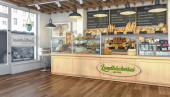Nowoczesny detal wnętrza z zielonymi płytkami metra, drewnianymi panelami i geometryczną podłogą z płytek