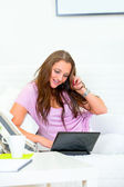 zadowolony ładny gospodyni na kanapie mówić na telefon i za pomocą laptopa