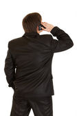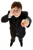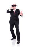 wstrząśnięty, młody biznesmen, patrząc przez lornetki