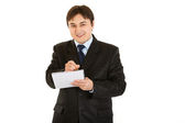 uśmiechający się młody biznesmen z zestawu słuchawkowego przytrzymanie puste schowka