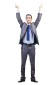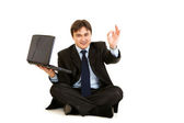siedząc na podłodze z laptopa uśmiechający się biznesmen Wyświetlono gest zwycięstwa
