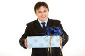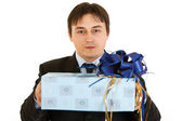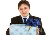 szczęśliwy młody biznesmen w kapelusz Świętego Mikołaja. chr Wesołych Świąt i szczęśliwego nowego roku