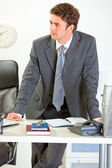 miło elegancki biznesmen siedzi w biurze informacji turystycznej