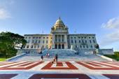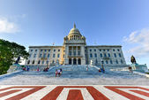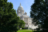 Widok z przodu Rhode Island State House z kopułą, otoczony drzewami i porannym światłem.