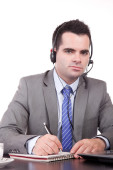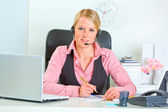 uśmiechający się biznesmen z słuchawki siedzi w biurze informacji turystycznej i patrząc na co
