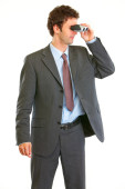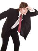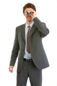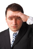 Koncentrat młody biznesmen, trzymając rękę na czole i szukam f