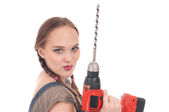 młoda kobieta zabawy w dżinsy kombinezon posiadający wiertarki udarowe