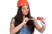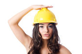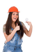 młody pracownik figlarny kobieta kombinezon i kask