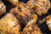 Zdjęcie "Uda z kurczaka pokryte aromatycznym pocieraniem i przyprawą, pieczone na patelni, gotowe do podania. Soczyste, aromatyczne i idealne na łatwe rodzinne kolacje, tygodniowe posiłki i obfite komfort jedzenia." może być wykorzystywane do celów osobistych i komercyjnych zgodnie z warunkami zakupionej licencji Royalty-free. Obraz jest dostępny do pobrania w jakości wysokiej rozdzielczości do 5760x3840.