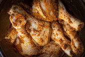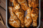 Uda z kurczaka pokryte aromatycznym pocieraniem i przyprawą, pieczone na patelni, gotowe do podania. Soczyste, aromatyczne i idealne na łatwe rodzinne kolacje, tygodniowe posiłki i obfite komfort jedzenia.