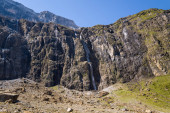 Szczyt gór wznosi się ponad warstwowymi skałami z cienkimi wodospadami i plamami zielonej roślinności, wszystko pod żywym błękitnym niebem w Cirque de Gavarnie.