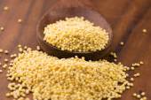 ciemna ceramiczna miska wypełniona po brzegi surowym żółtym proso, z rączką drewnianej łyżki wystającej od tyłu na czarnym marmurowym tle.