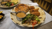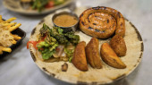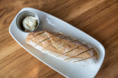 Brązowe australijskie bochenki żyta spoczywają na wiejskiej drewnianej desce z małymi kubkami masła, ostrym nożem i szklanką napoju, tworząc przytulną, estetyczną scenę jadalną. Australijski naturalny fermentowany chleb brązowy czarny