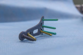 Wysokiej rozdzielczości fotografia zbliżeniowa złotej ortopedycznej płytki kostnej z wieloma śrubami chirurgicznymi zamontowanymi kolejno, umieszczonymi na sterylnym niebieskim, chirurgicznym drapaczu. Obraz ilustruje nowoczesną technologię implantów ortopedycznych stosowaną do mocowania złamań