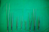Zdjęcie "Wysokiej rozdzielczości płaskie zdjęcie ortopedycznych instrumentów chirurgicznych i implantów umieszczonych na sterylnej niebieskiej zasłonie chirurgicznej. Obraz pokazuje płytkę kostną z wieloma złotymi śrubami ortopedycznymi, obok precyzyjnych narzędzi chirurgicznych, takich jak scr" może być wykorzystywane do celów osobistych i komercyjnych zgodnie z warunkami zakupionej licencji Royalty-free. Obraz jest dostępny do pobrania w jakości wysokiej rozdzielczości do 5760x3840.