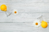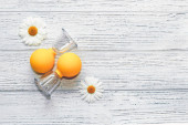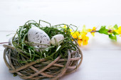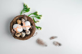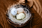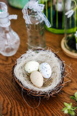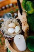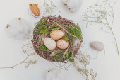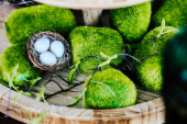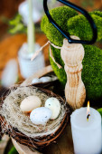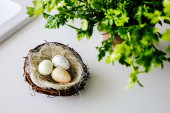 Małe gniazdo zawiera trzy jajka w różnych kolorach. Świeże zielone zioła są umieszczone w pobliżu na jasnej powierzchni. Ten układ pokazuje prosty motyw natury w kuchni ustawienie.