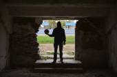 Młody mężczyzna stojący w stary opuszczony budynek z piłka nożna bal