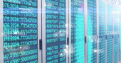 Kod strumieniowy nakładający się na centralne szafki serwerowe w przejściu centrów danych, pokazujący plik ENCRYPTION. Obiekty przemysłowe, cybernetyczne, diody LED, okablowanie, sieć, przełączniki
