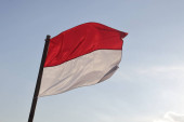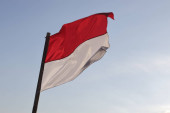 Indonezyjska flaga narodowa trzepocze w wietrze na tle szklanych okien nowoczesnych drapaczy chmur w metropolii. Patriotyzm narodowy. Indonezyjski Dzień Niepodległości.