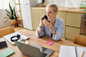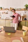 Młoda kobieta z kręconymi włosami cieszy się pracą przy eleganckim stole kuchennym.