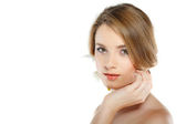 piękna dziewczyna białogłowy, na białym tle na białym tle, emocje, cosm