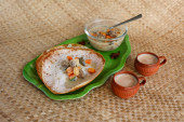 Zdjęcie "Miękki, koronkowy appam serwowany z kremowym gulaszem z kurczaka, urządzone na Boże Narodzenie śniadanie, podkreślając tradycyjną kuchnię Kerala, świąteczne jedzenie komfort i South Indian wakacje jadalnia" może być wykorzystywane do celów osobistych i komercyjnych zgodnie z warunkami zakupionej licencji Royalty-free. Obraz jest dostępny do pobrania w jakości wysokiej rozdzielczości do 5760x3840.