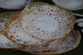 Miękki, koronkowy appam serwowany z kremowym gulaszem z kurczaka, urządzone na Boże Narodzenie śniadanie, podkreślając tradycyjną kuchnię Kerala, świąteczne jedzenie komfort i South Indian wakacje jadalnia