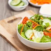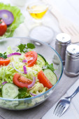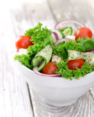 miska sałatki z ogórków, cebuli i pomidorów z serem