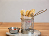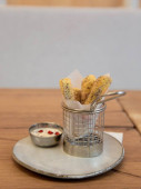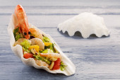 Tacos krewetki serwowane w uchwycie taco metalu z sosem i ziołami, restauracja fotografia żywności, widok z przodu na drewniany stół