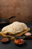 shakshouka Jajecznica serwowana w żeliwnej patelni z chlebem tostowym, śniadanie fotografia żywności na drewnianym stole, widok z przodu.
