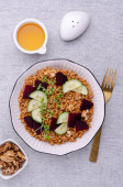 Falafel miska z hummusem, awokado, marynowane warzywa i prażona ciecierzyca, zdrowa restauracja Fotografia żywności z rękami trzymając miskę, widok z przodu.